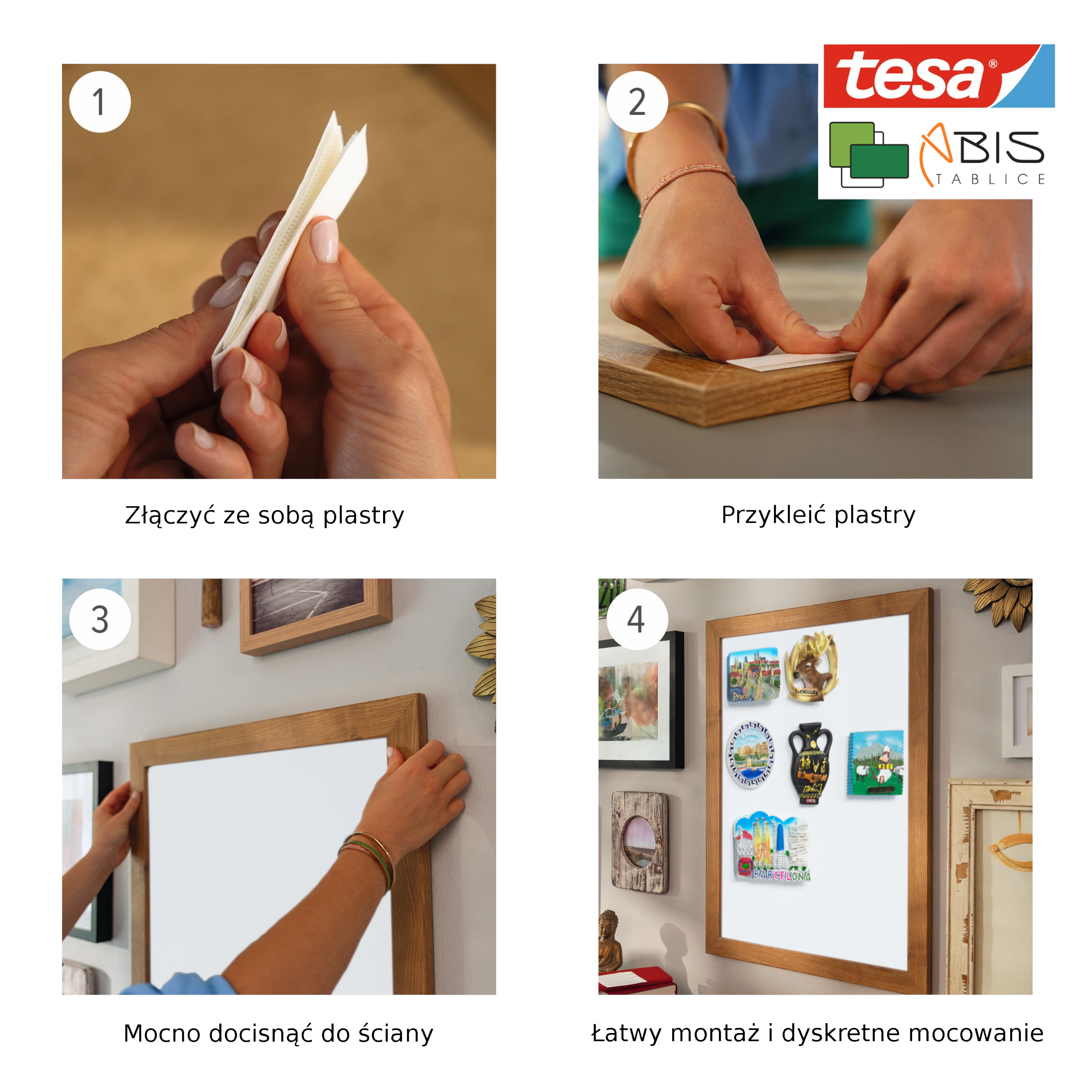 Montaż tablicy przy pomocy rzepów. Główna zaleta tego montażu to niewidoczne mocowanie: rzepy są całkowicie zakryte przez ramę tablicy.
